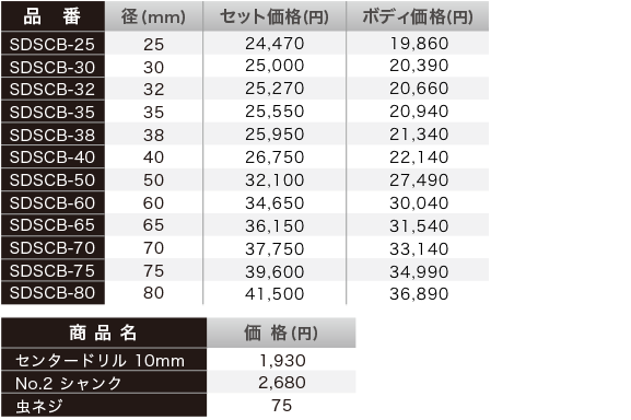 小型軽量化が進むハンマードリルに対応して、SDSタイプは600Wタイプとして 22φ ~ 80φの口径に威力を発揮します。